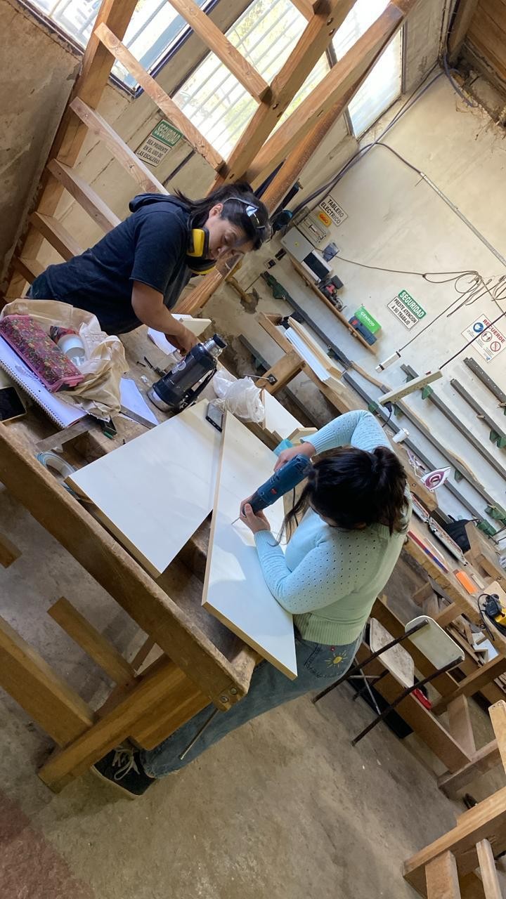 Una vez que llegó el material, el trabajo se intensificó. Los estudiantes se dedicaron a trabajar cada pieza, realizando tareas esenciales como cantos, perforaciones y ranuras. «Luego regruesamos la tapa y la canteamos con canto doble. Después, pre-acabamos cada pieza y armamos», compartieron los jóvenes destacando el proceso colaborativo que llevó a la realización del mueble guiados por el Instructor Mariano padilla.